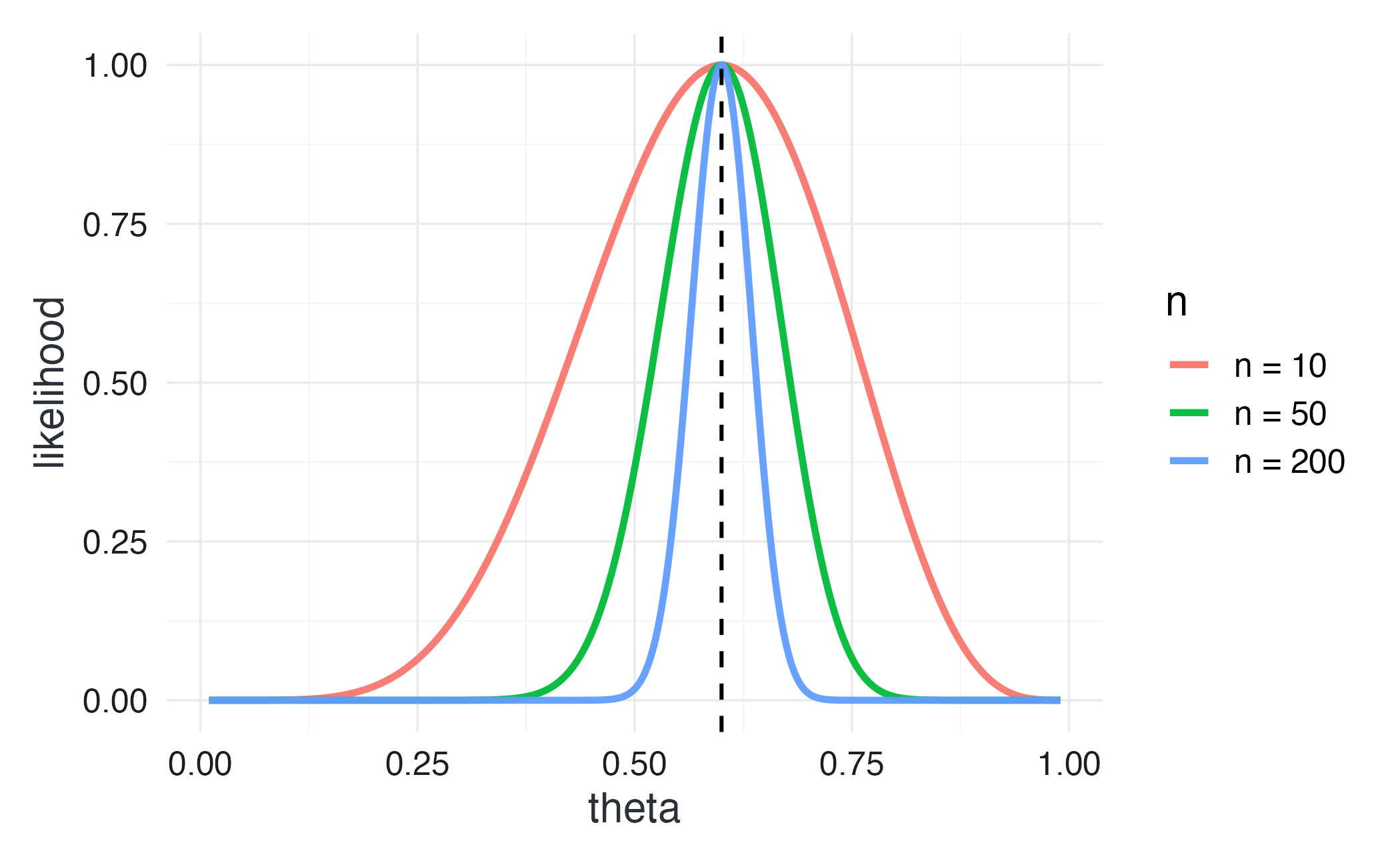 Conseguenza per la verosimiglianza. Poiché la verosimiglianza riflette l’incertezza sulla posizione del parametro, questa proprietà spiega perché la funzione di verosimiglianza diventa sempre più concentrata al crescere di \(n\). In termini intuitivi, più dati osserviamo, meno valori di \(\theta\) restano compatibili con l’evidenza.